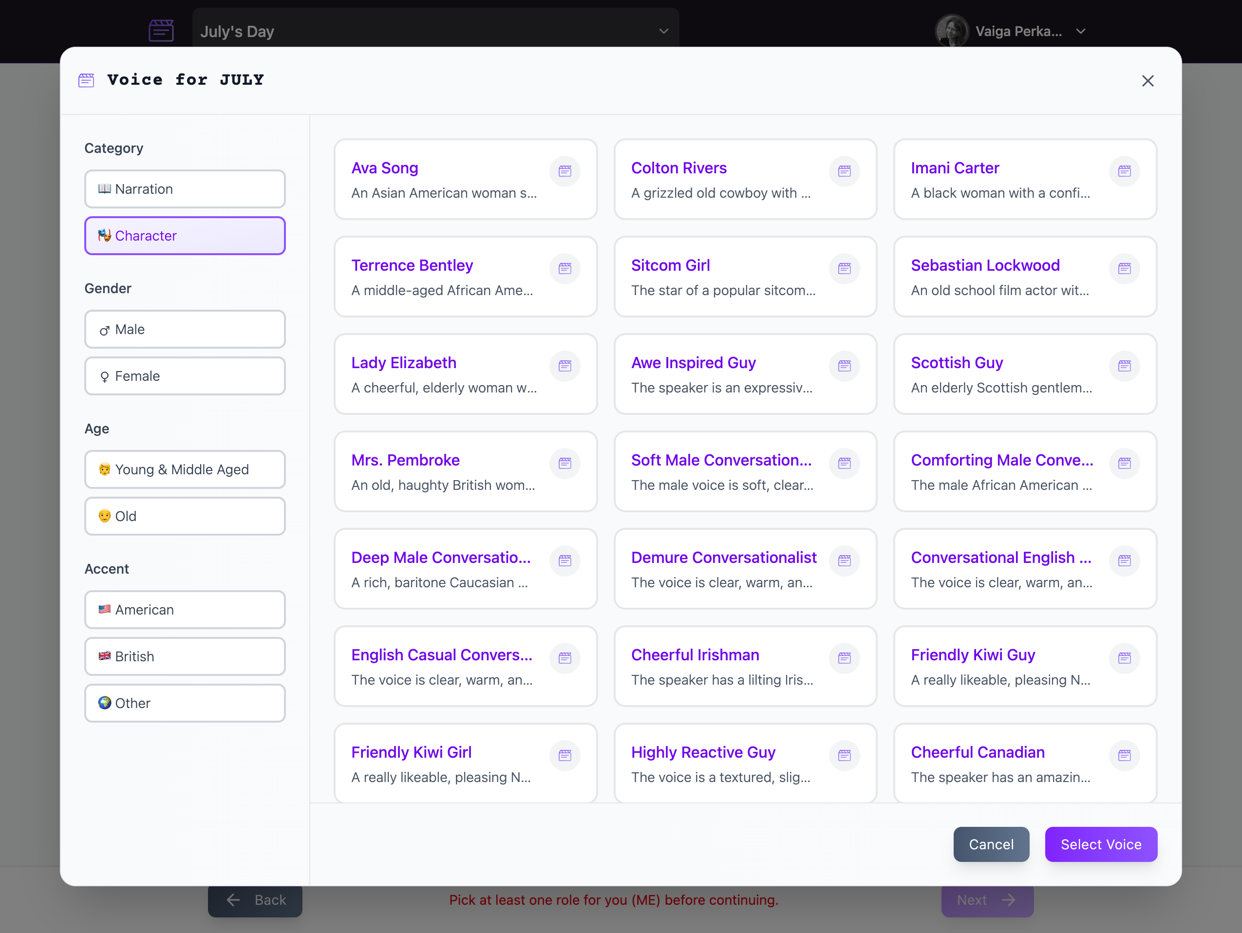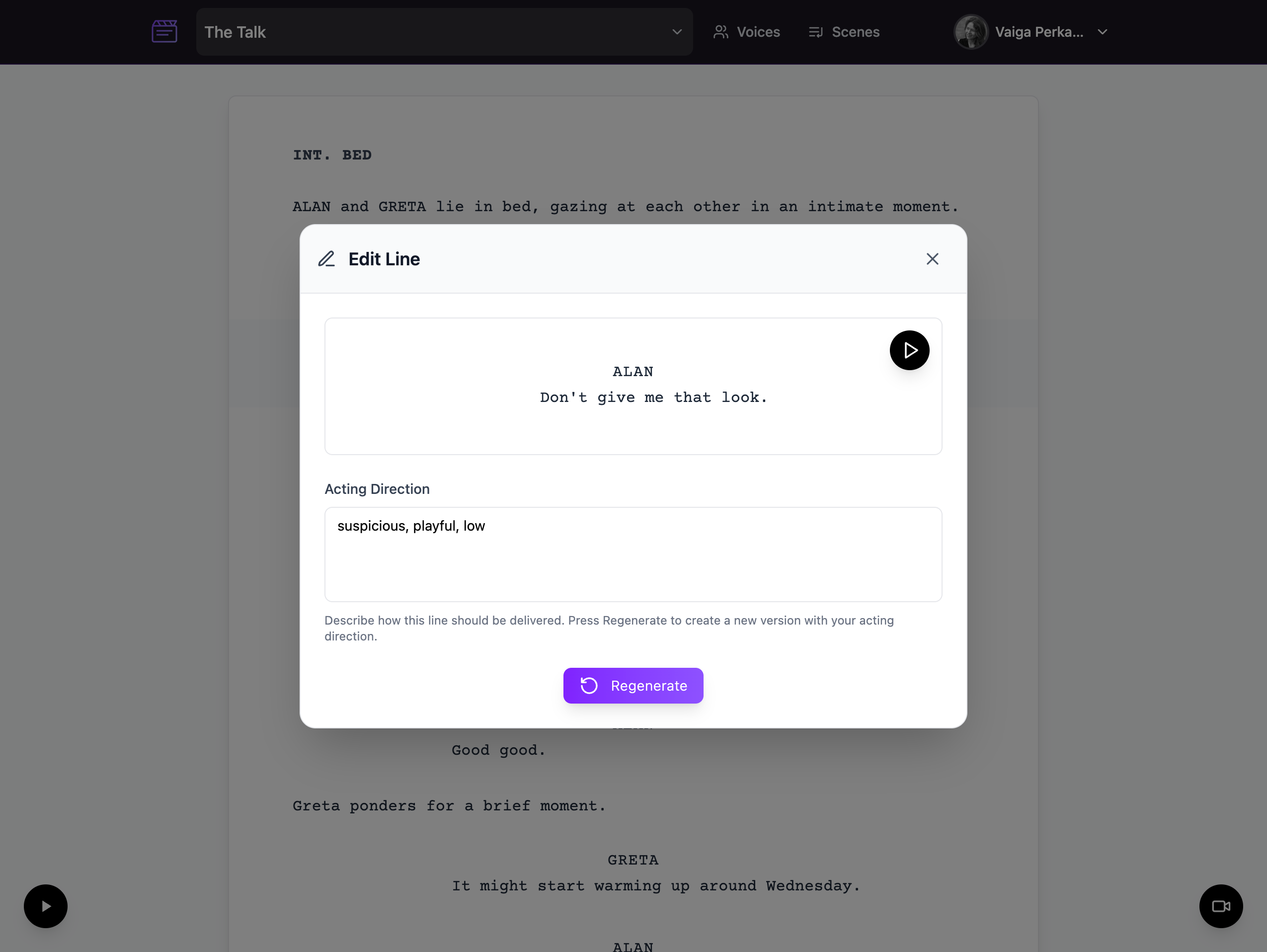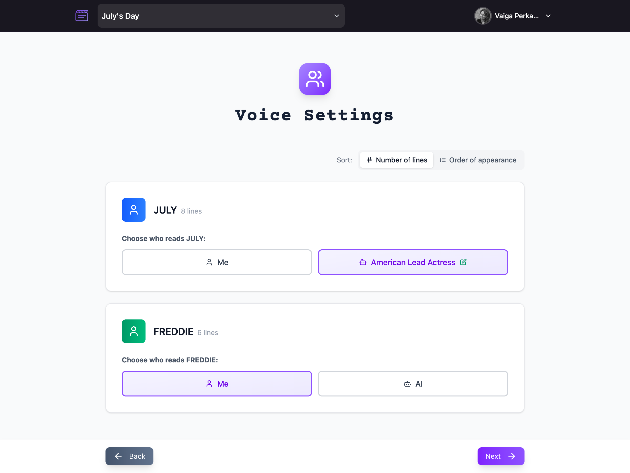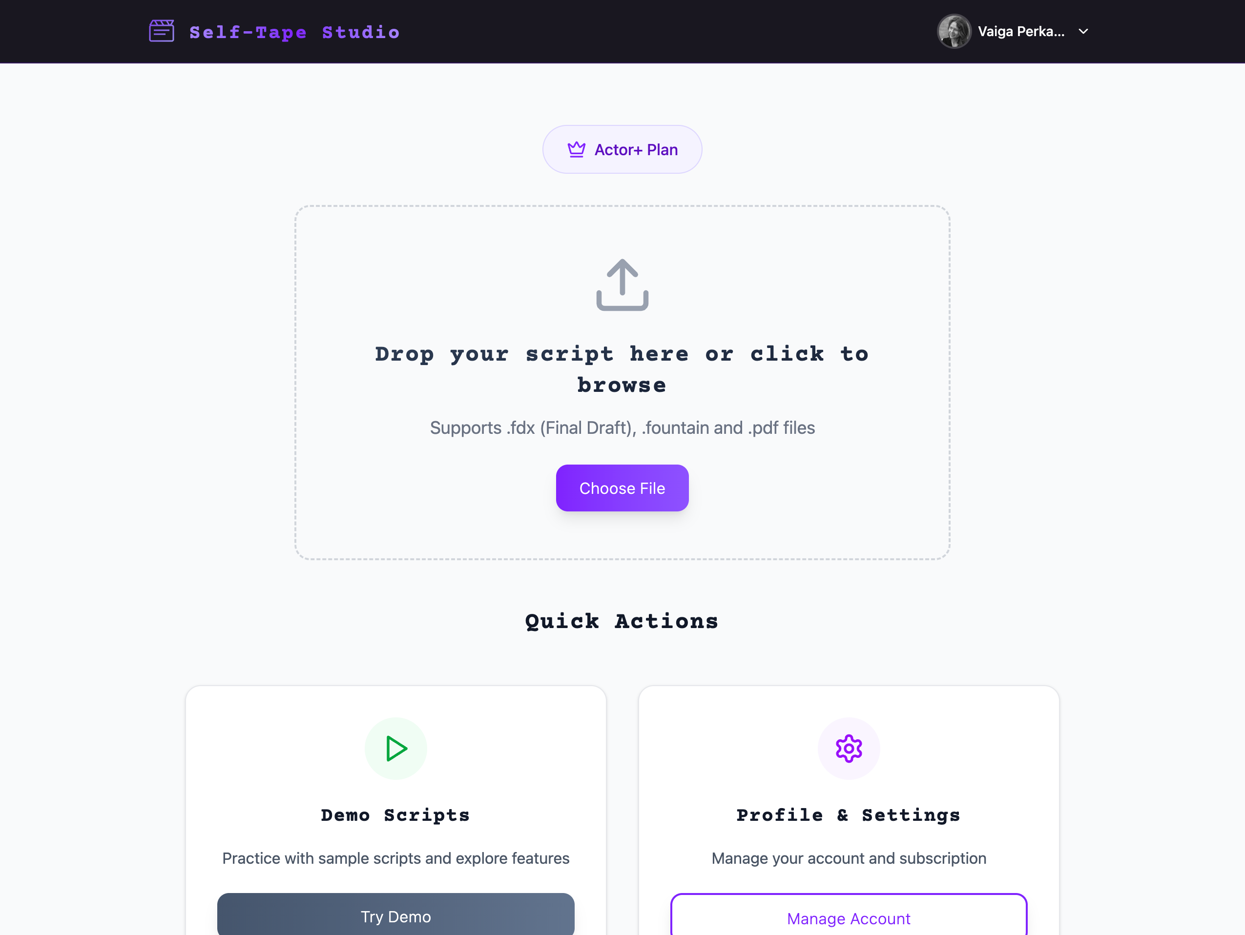 Rehearse your sides, choose AI partner voices, and record video takes fast.